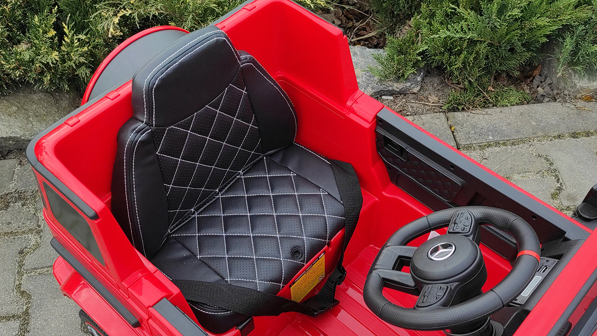 Zainspirowany legendarnym modelem Mercedes AMG G63, nasz pojazd nie tylko imponuje wyglądem, ale także zapewnia niezrównany komfort jazdy. Siedzenie wyściełane ekoskórą z pasami bezpieczeństwa gwarantuje wygodę nawet podczas dłuższych eskapad.