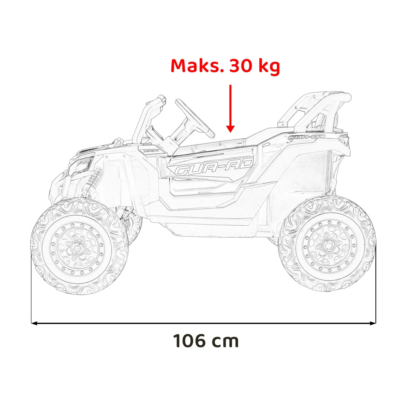 Buggy ATV Defend 4x4 jest wyposażony w cztery silniki o mocy 35W każdy, co daje łączną moc 140W. Takie rozwiązanie zapewnia nie tylko dużą siłę napędową, ale także umożliwia pokonywanie różnorodnych nawierzchni, od gładkich dróg po trudniejszy teren. Akumulator o pojemności 12V/10Ah pozwala na długie godziny zabawy, a wskaźnik naładowania na kokpicie umożliwia stałe monitorowanie poziomu baterii.
