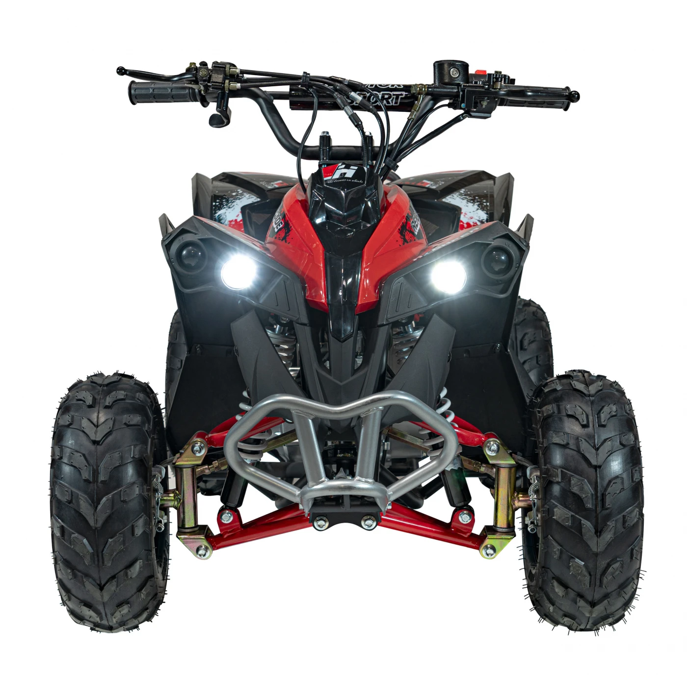 Quad został wyposażony w przednie i tylne światła, co zwiększa bezpieczeństwo i widoczność podczas jazdy w nocy. Włącznik świateł umożliwia łatwe sterowanie oświetleniem, a przednie światła oferują dwie pozycje: mijania i postojowe.