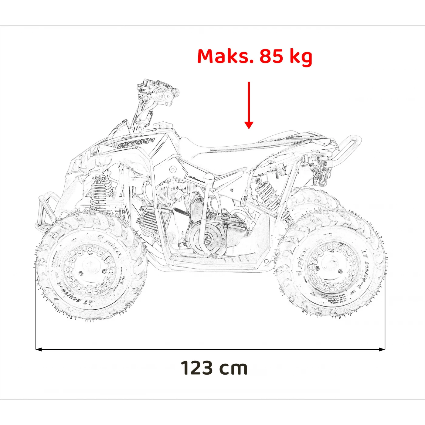 Quad RENEGADE HIPERFECT 110CC został zaprojektowany z myślą o ergonomii i wygodzie użytkowania. Jego wymiary to 123 cm długości, 80 cm szerokości i 73 cm wysokości. Dzięki tym kompaktowym wymiarom jest zwrotny i łatwy do manewrowania, co czyni go idealnym do jazdy w różnych warunkach terenowych.