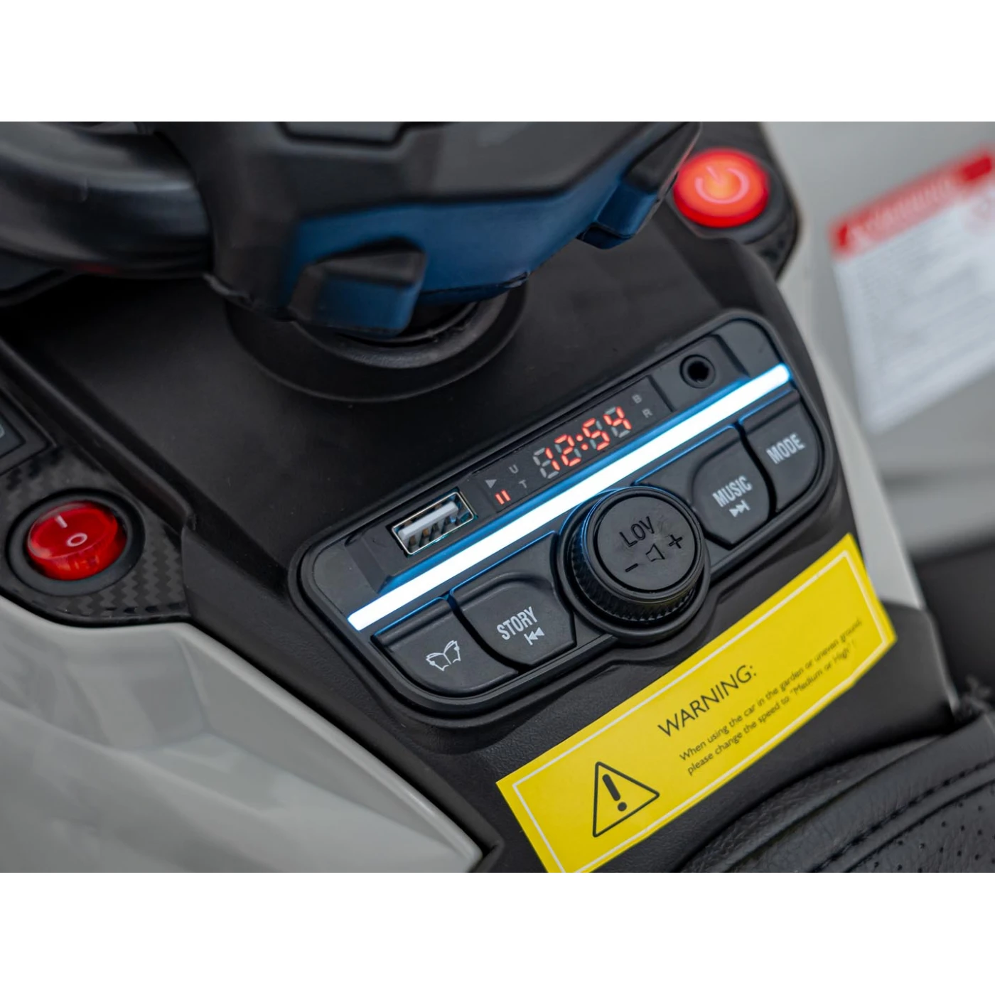 Quad Can-Am Outlander nie tylko świetnie wygląda, ale również oferuje bogate wyposażenie multimedialne. Wbudowany panel audio z MP3, Bluetooth, AUX i USB pozwala na odtwarzanie ulubionej muzyki dziecka, a radio FM dodaje jeszcze więcej możliwości rozrywki. Dodatkowo pojazd posiada dźwięki klaksonu, realistyczny odgłos przyspieszenia oraz wgrane melodyjki.